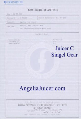 The test used the nutritional analysis on 500 mg of juice extracted using four leading juice machine: Juicer A: Angel Juicer Angelia 7500 juicer is the latest of the Angel/ super angel juicer models at the time of the testing: Calcium (82.8 mg/kg), Magnesium (15.0 mg/kg). View Certificate A. Notice a huge difference between our latest of the Angel/ super angel juicer machine compared to the nutrition extracted by our closest competitions as noted bellow. Notice that our competitors' nutritional content in the pulp thrown exceeded that what was extracted when compared to the nutrition extracted by the Angel juicer model Angelia 7500. Juicer B: Another twin gear juicer on the market: Calcium (11.9 mg/kg), Magnesium (5.5mg/kg). View Certificate B Juicer C: Single gear type juicer on the  market: Calcium (11.5 mg/kg), Magnesium (4.4 mg/kg). View Certificate C Juicer D: Centrifugal type juicer on the  market: Calcium (4.9 mg/kg), Magnesium (2.9mg/kg). View Certificate D
